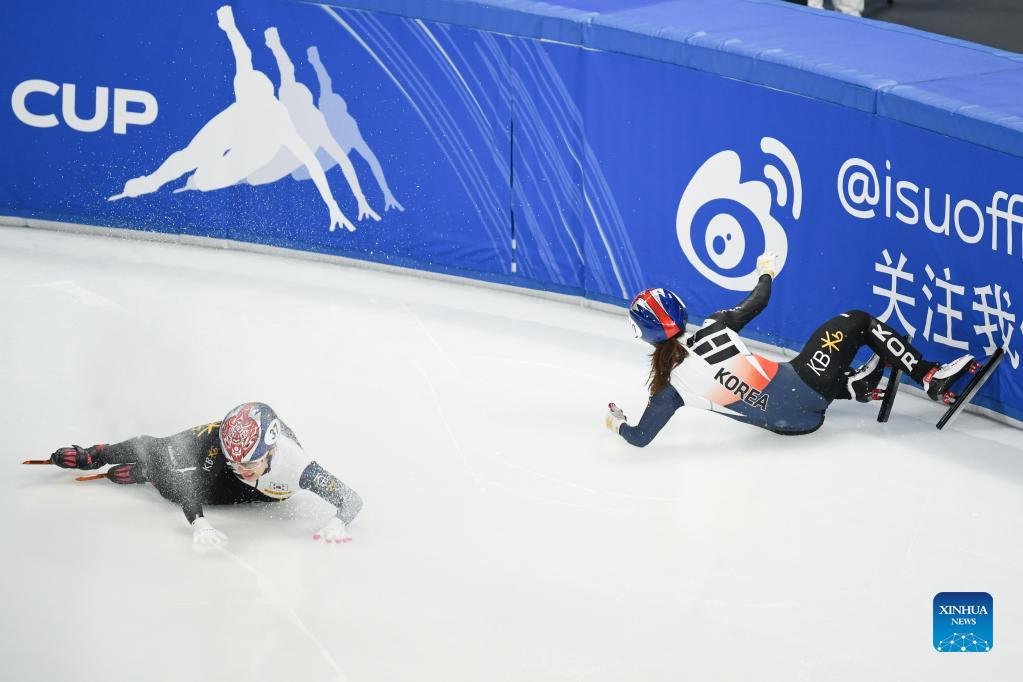 Choi Minjeong (R) and Kim Jiyoo of South Korea crash out during the women's 1500m final at ISU World Cup Short Track 2021/2022 in Beijing, capital of China, on Oct. 23, 2021. (Xinhua/Ju Huanzong)