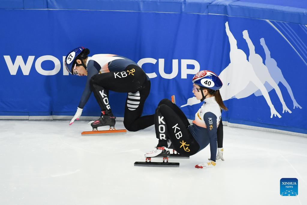 Choi Minjeong (R) and Kim Jiyoo of South Korea crash out during the women's 1500m final at ISU World Cup Short Track 2021/2022 in Beijing, capital of China, on Oct. 23, 2021. (Xinhua/Ju Huanzong)