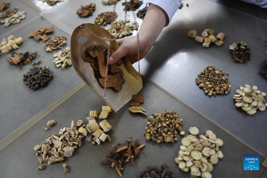 A pharmacist fulfills a Chinese Traditional Medicine (TCM) prescription at Gansu Provincial Hospital of Traditional Chinese Medicine (TCM) in Lanzhou, northwest China's Gansu Province, Oct. 23, 2021. Pharmacists of the hospital are busy providing decoctions for COVID-19 prevention and control to individuals under medical quarantine and medical workers at the frontline. The hospital also offered the decoctions to local residents for free at the outpatient hall. (Xinhua/Chen Bin)