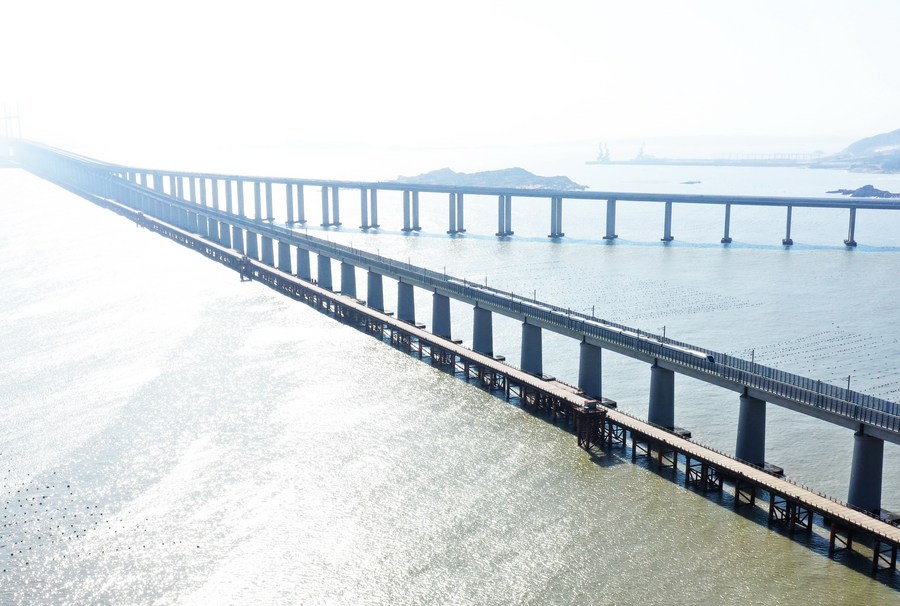 A train runs on the Pingtan Strait Road-rail Bridge of Fuzhou-Pingtan railway in southeast China's Fujian Province on Dec. 26, 2020. (Xinhua/Lin Shanchuan)