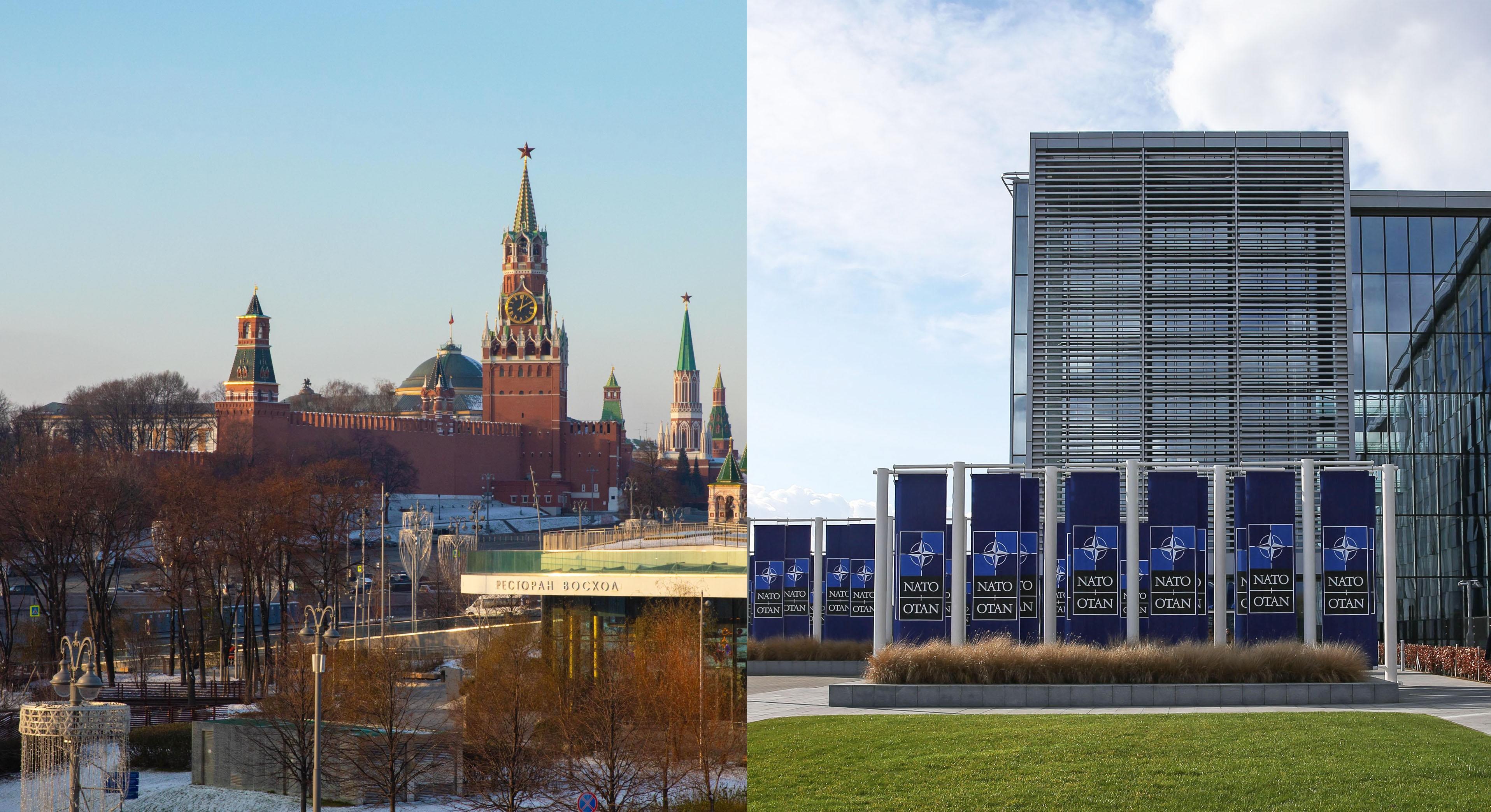 Xinhua file photos of the Kremlin in Moscow (L) and the NATO headquarters in Brussels