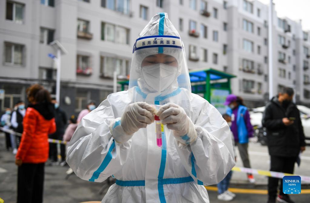 A meical member packs a test tube containing nucleic acid samples at a temporary nucleic acid testing site in Hohhot, north China's Inner Mongolia Autonomous Region, Oct. 24, 2021. To curb the spread of COVID-19, the city of Hohhot has launched nucleic acid testing for residents from key regions and all people entering and leaving Hohhot by air, train, shuttle bus, taxi, private cars and other means of transportation. (Xinhua/Peng Yuan)