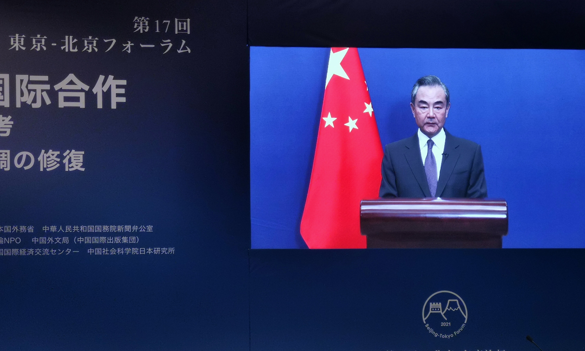 Wang Yi gives a speech at the opening ceremony of the 17th Annual Beijing-Tokyo Forum via video link on October 25, 2021. Photo: Xu Keyue/GT