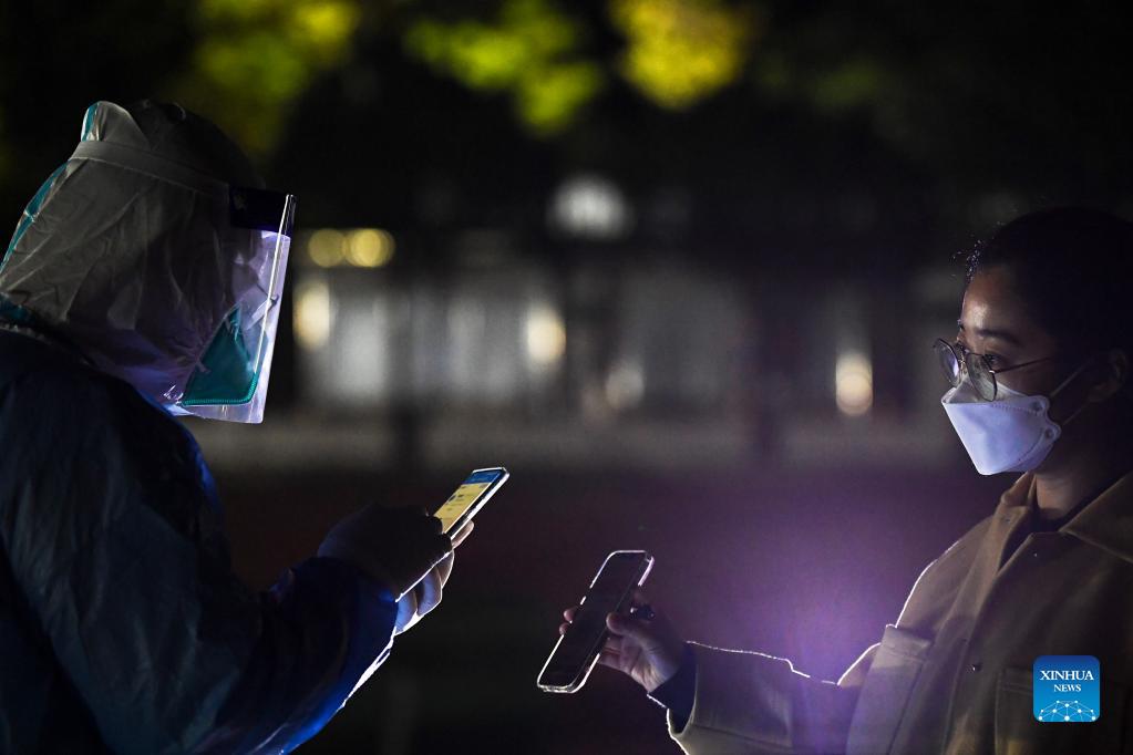 A medical worker scans QR code to register personal information of a resident for nucleic acid testing at a sampling site during the latest COVID-19 outbreak in Yinchuan, northwest China's Ningxia Hui Autonomous Region, Oct. 23, 2021. Thousands of medical workers are on duty around the clock at more than 500 sampling sites in key districts of Yinchuan to conduct the test. (Xinhua/Feng Kaihua)