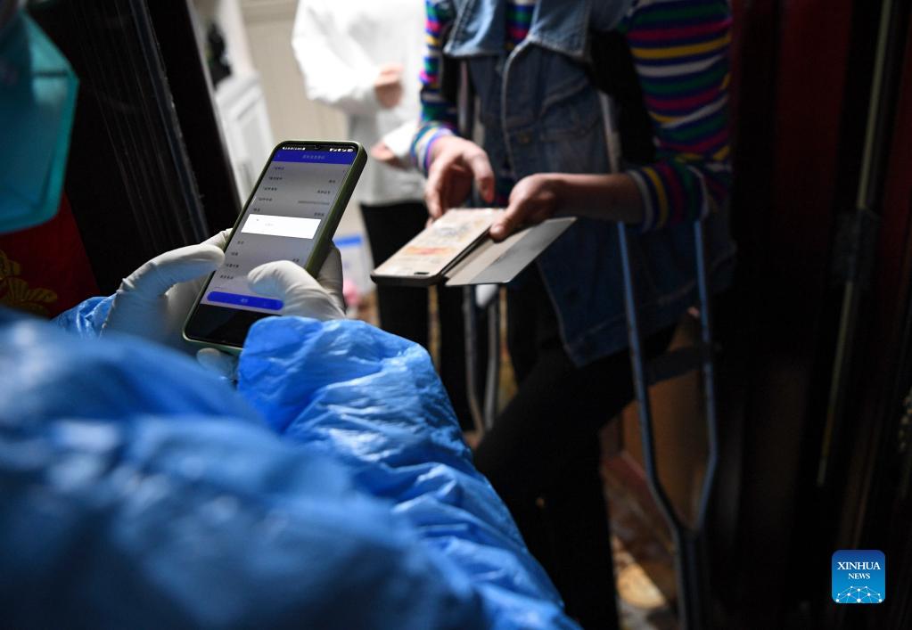 A medical worker registers the personal information of a resident with mobility problem at her residence during the latest COVID-19 outbreak in Yinchuan, northwest China's Ningxia Hui Autonomous Region, Oct. 23, 2021. Thousands of medical workers are on duty around the clock at more than 500 sampling sites in key districts of Yinchuan to conduct the test. (Xinhua/Feng Kaihua)