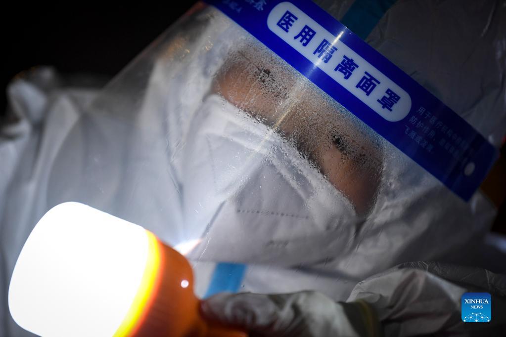 A medical worker takes swab samples for nucleic acid testing at a sampling site during the latest COVID-19 outbreak in Yinchuan, northwest China's Ningxia Hui Autonomous Region, Oct. 23, 2021. Thousands of medical workers are on duty around the clock at more than 500 sampling sites in key districts of Yinchuan to conduct the test. (Xinhua/Feng Kaihua)