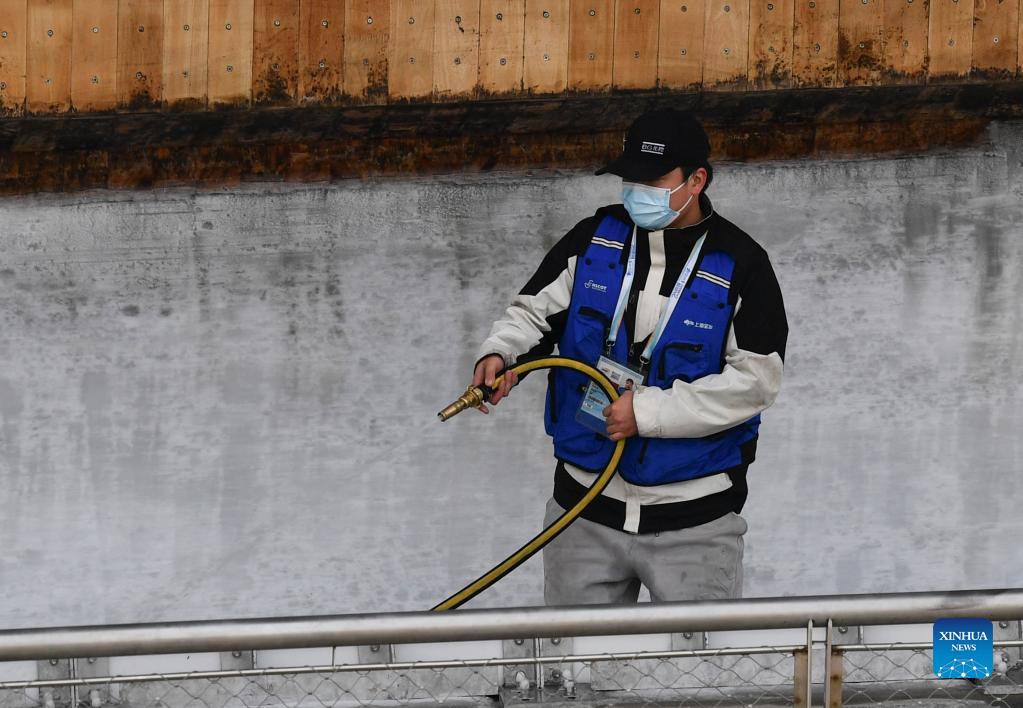 A staff member maintains the track during a skeleton test event for the Beijing 2022 Olympic Winter Games at the National Sliding Center in Yanqing Zone, Beijing, capital of China, Oct. 25, 2021. (Xinhua/He Changshan)
