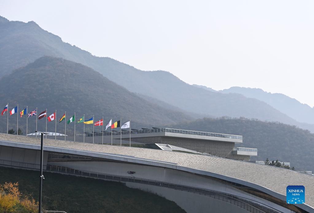 An athlete competes during a women's skeleton test event for the Beijing 2022 Olympic Winter Games at the National Sliding Center in Yanqing Zone, Beijing, capital of China, Oct. 25, 2021. (Xinhua/He Changshan)
