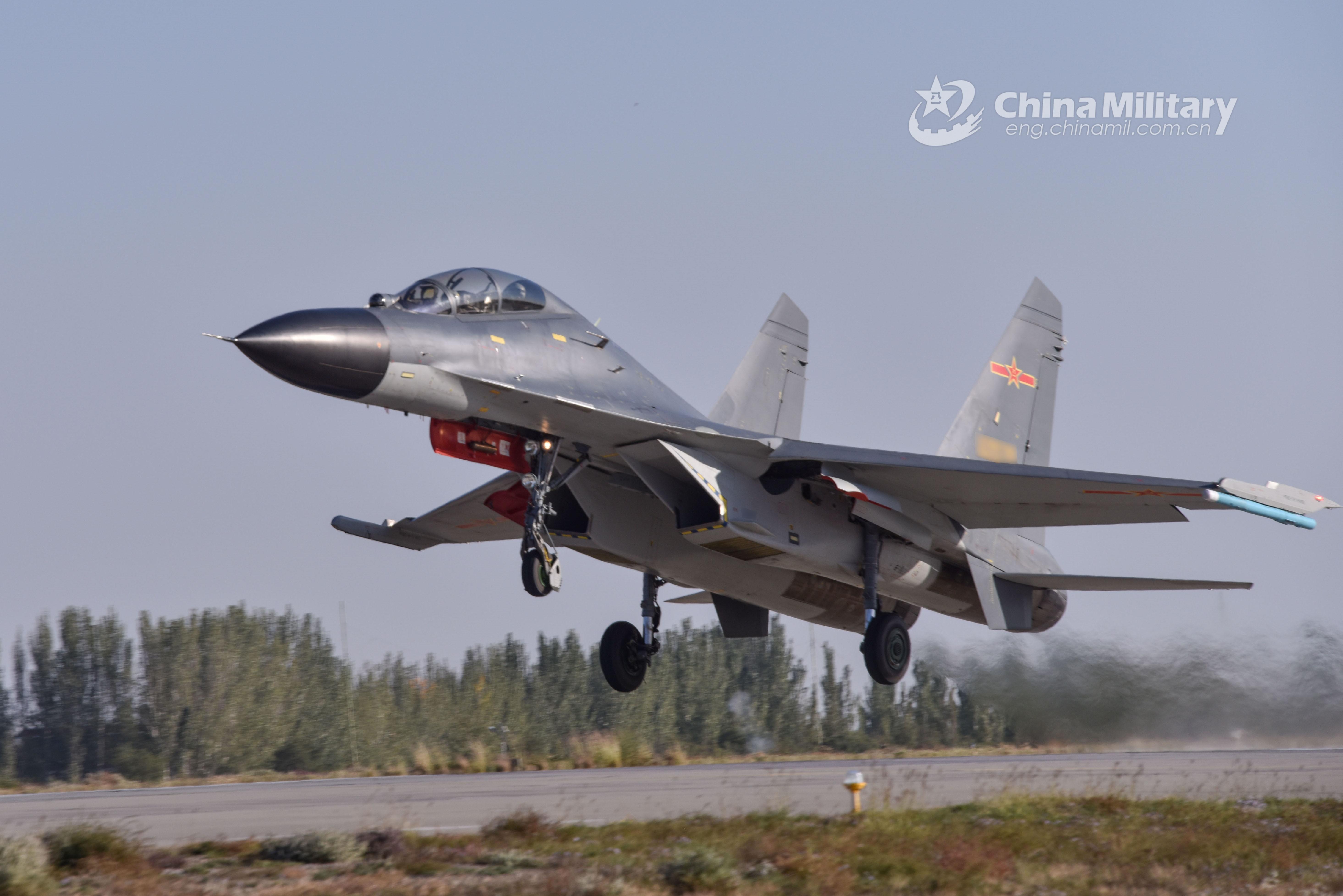 A fighter jet attached to an aviation brigade of the air force under the PLA Western Theater Command takes off for a flight training exercise on October 10, 2021. (eng.chinamil.com.cn/Photo by Zhao Dian)