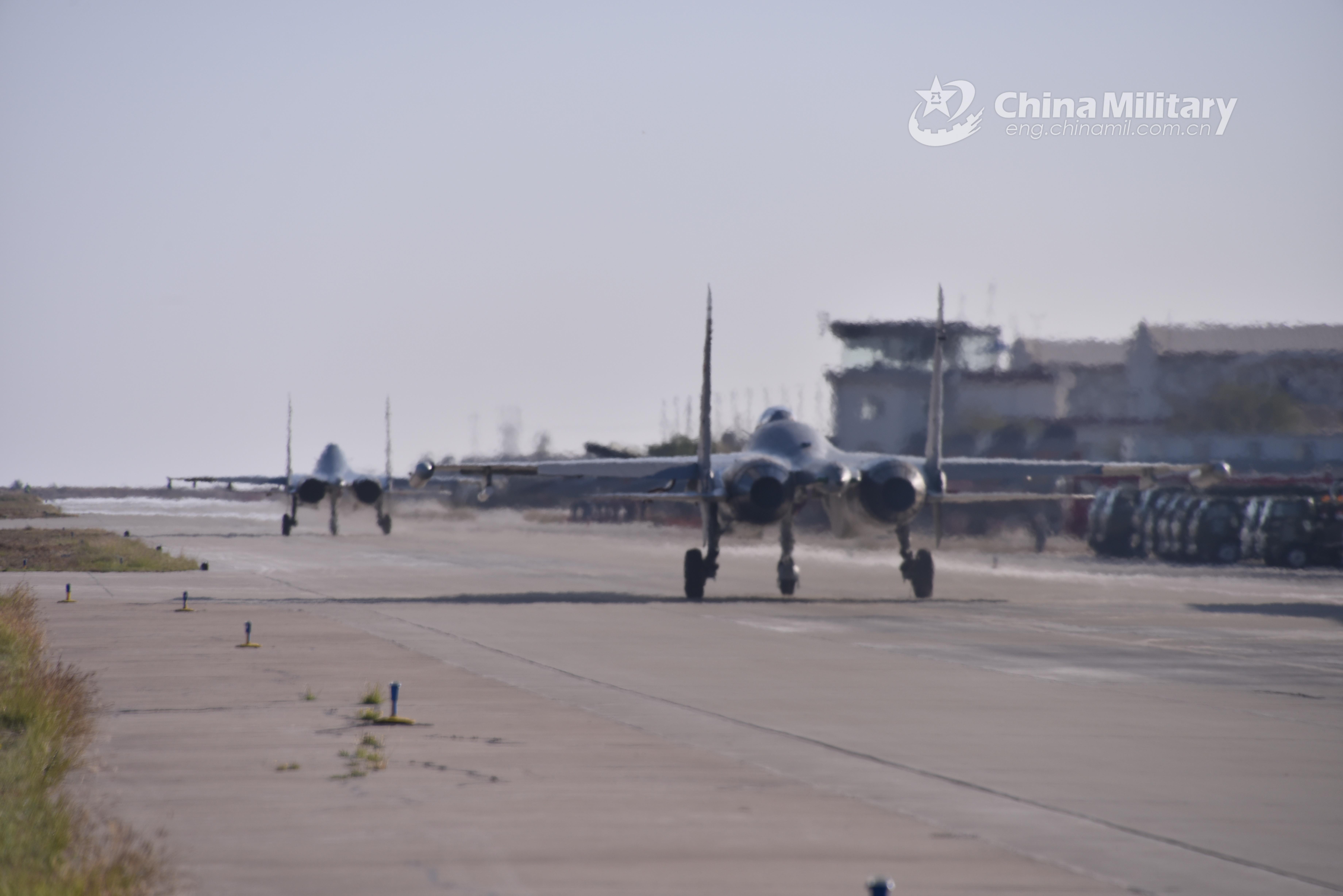 Fighter jets attached to an aviation brigade of the air force under the PLA Western Theater Command taxi in formation to get in position for takeoff during a flight training exercise on October 10, 2021. (eng.chinamil.com.cn/Photo by Zhao Dian)