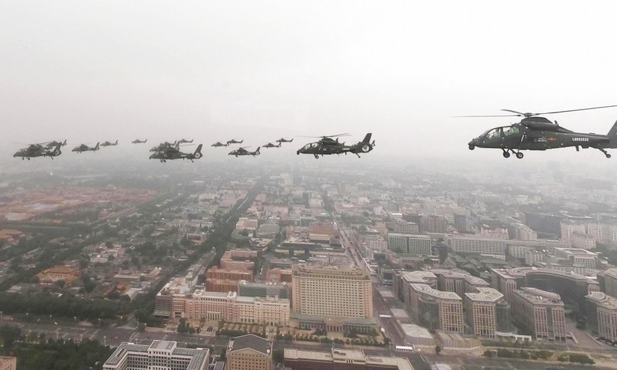 Military aircraft fly in echelons ahead of a grand gathering celebrating the Communist Party of China (CPC) centenary in Beijing, capital of China, July 1, 2021. (Xinhua/Han Mingkun)