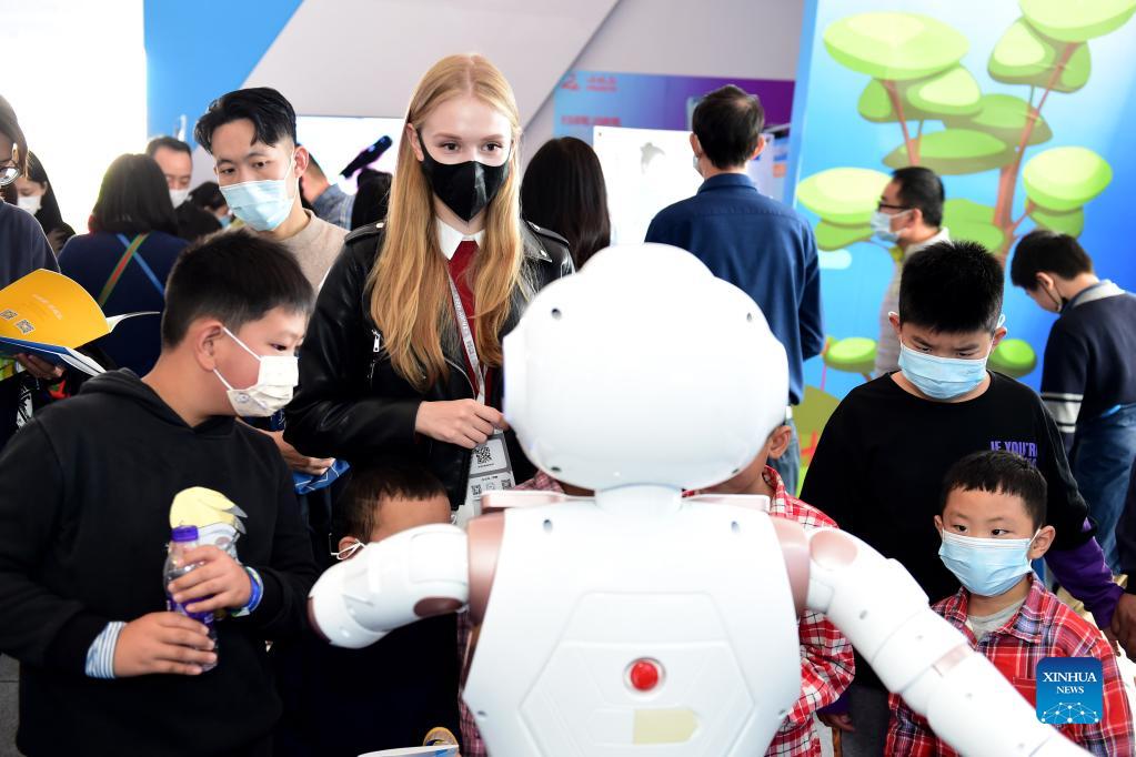 Ukrainian student Aly interacts with a robot at the 4th World Voice Expo in Hefei, capital of east China's Anhui Province, Oct. 24, 2021. Aly has been studying Chinese for seven years and now she is a graduate student at Anhui University. She has spent her time trying high-tech products at the World Voice Expo and believes that these products could make a better life for us. Companies and developers specializing in artificial intelligence (AI) and speech technology gathered in Hefei, capital of east China's Anhui Province on Monday for the 4th World Voice Expo and Global 1024 Developer Festival. With the theme of "Symbiosis with AI, a New Journey," the expo features more than 1,000 cutting-edge AI products in fields such as manufacturing, education, medical care and smart city management. The event is mainly organized by iFLYTEK, an AI and speech-technology giant based in Anhui. More than 2.65 million developers from home and abroad have joined an open AI innovation platform backed by iFLYTEK since its launch in 2010, churning out more than 1.26 million applications. (Xinhua/Huang Bohan)