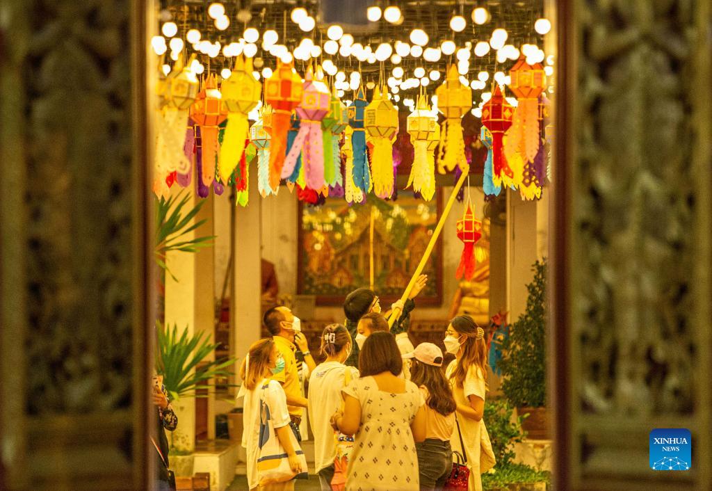 Tourists hang lanterns at the Wat Phra That Hariphunchai in Lamphun, Thailand, Oct. 25, 2021. Lamphun Province of Thailand held a grand lantern festival at the Wat Phra That Hariphunchai, attracting tourists to hang lanterns and make wishes. (Xinhua/Wang Teng)