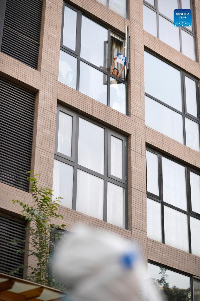 A little girl shows her painting to staff members at a residential compound locked down due to COVID-19 resurgence in Jinfeng District, Yinchuan, northwest China's Ningxia Hui Autonomous Region, Oct. 24, 2021. (Xinhua/Wang Peng)