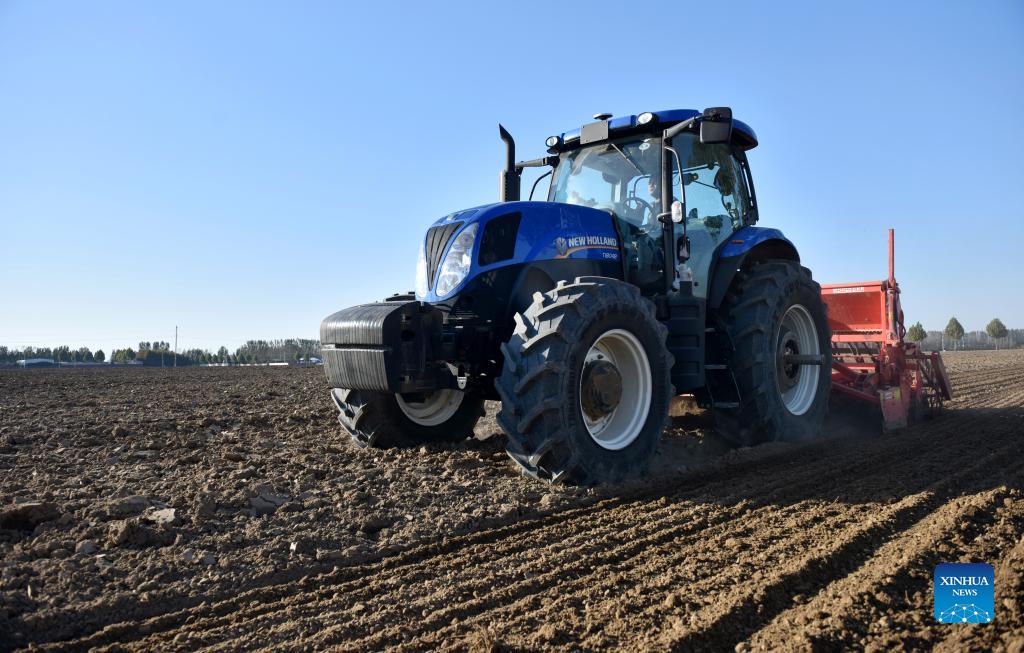 An agricultural machine sows seeds of winter wheat in the fields at Yanli Township in Xingtai, north China's Hebei Province, Oct. 26, 2021. (Xinhua/Zhu Xudong)