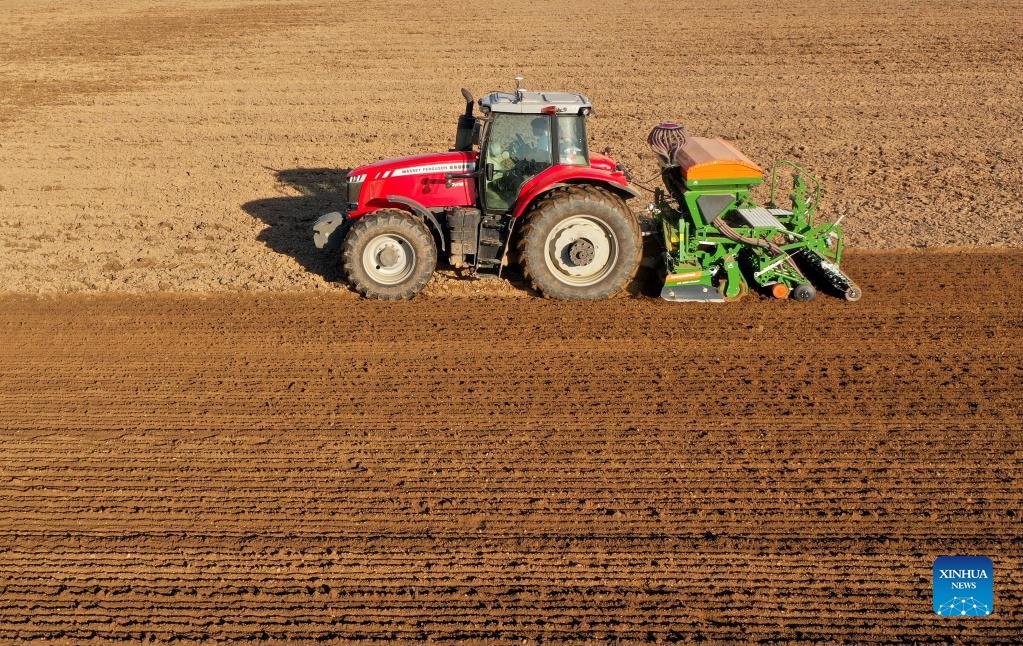 Aerial photo taken on Oct. 26, 2021 shows an agricultural machine sowing seeds of winter wheat in the fields at Yanli Township in Xingtai, north China's Hebei Province. (Xinhua/Zhu Xudong)
