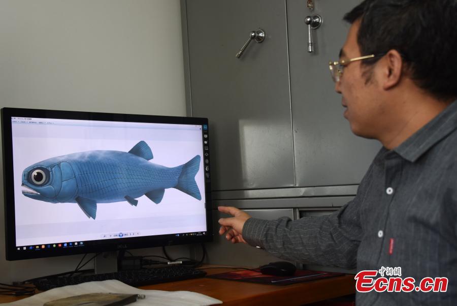 Photo taken on Oct. 26, 2021 shows Xu Guanghui introducing the fossil specimen of the oldest species of Peltoperleidus. (Photo: China News Service/Sun Zifa)