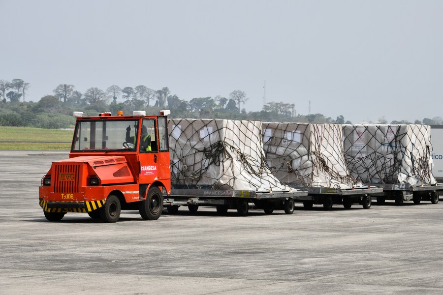 Photo taken on Feb. 10, 2021 shows Sinopharm COVID-19 vaccines are transported in Malabo, Equatorial Guinea. (Photo by Li Boyuan/Xinhua)