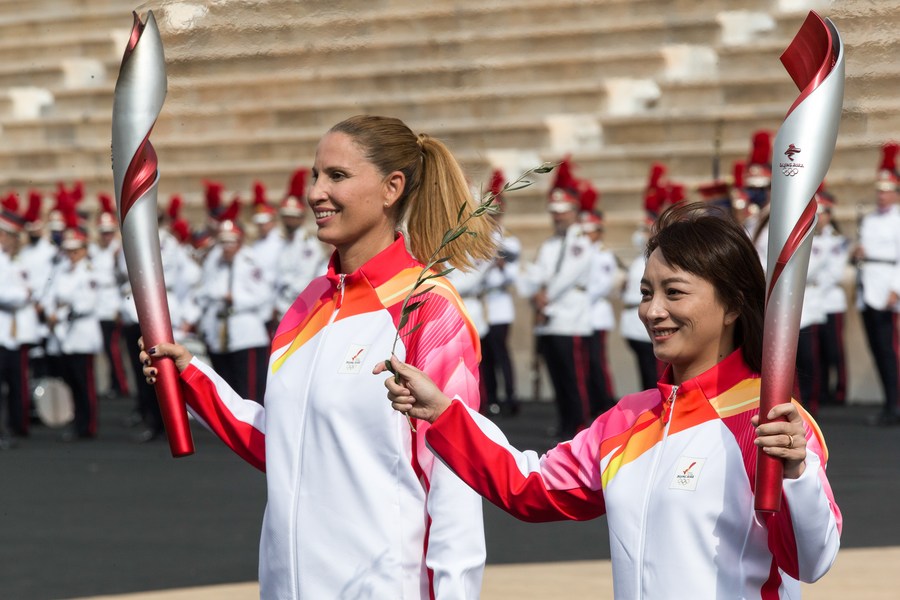 Former Greek water polo athlete Evi Moraitidou (L) and former Chinese freestyle skiing aerials athlete Li Nina pose during the handover ceremony of the Olympic Flame for the Beijing 2022 Winter Olympic Games at the Panathenaic Stadium in Athens, Greece, Oct. 19, 2021. (Xinhua/Marios Lolos)