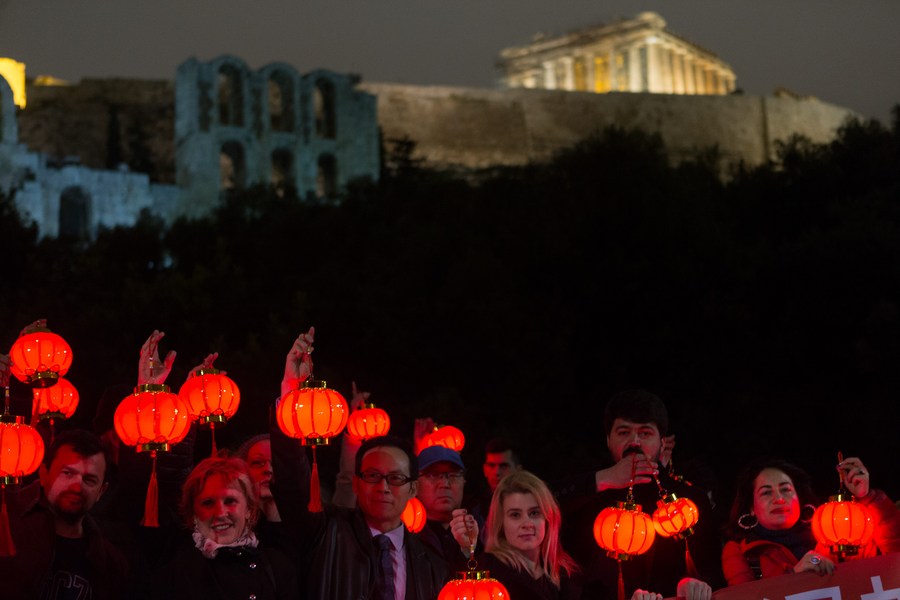 Greeks and Chinese people living in Greece hold red lanterns at the foot of the Acropolis hill in Athens, Greece, Feb. 14, 2020. (Xinhua/Marios Lolos)