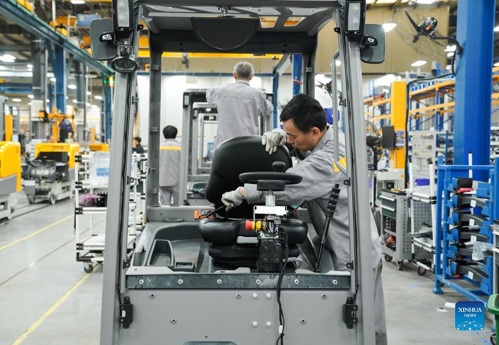 A worker works at a production line of Jungheinrich AG in Qingpu district of east China's Shanghai, Oct. 20, 2021. Jungheinrich AG, a leading intralogistics solutions provider based in Germany, would take part in the China International Import Expo (CIIE) for the fourth time this year. (Xinhua/Ding Ting)