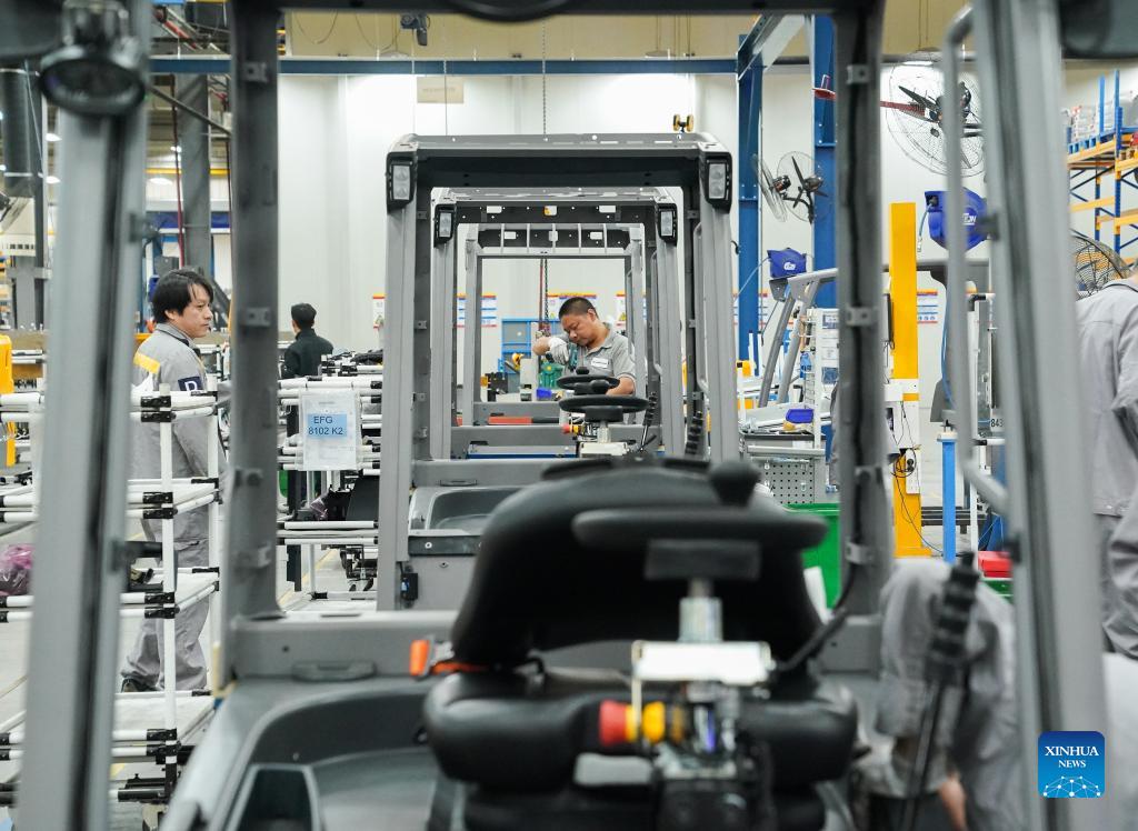 Workers work at a production line of Jungheinrich AG in Qingpu district of east China's Shanghai, Oct. 20, 2021. Jungheinrich AG, a leading intralogistics solutions provider based in Germany, would take part in the China International Import Expo (CIIE) for the fourth time this year. (Xinhua/Ding Ting)