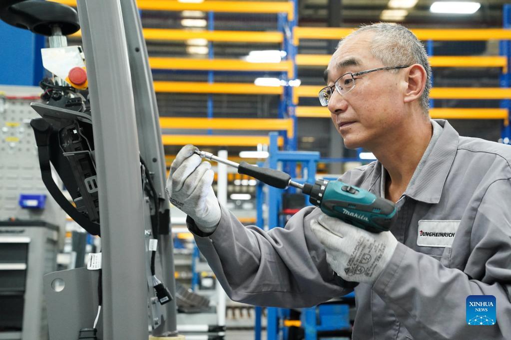 A worker works at a production line of Jungheinrich AG in Qingpu district of east China's Shanghai, Oct. 20, 2021. Jungheinrich AG, a leading intralogistics solutions provider based in Germany, would take part in the China International Import Expo (CIIE) for the fourth time this year. (Xinhua/Ding Ting)