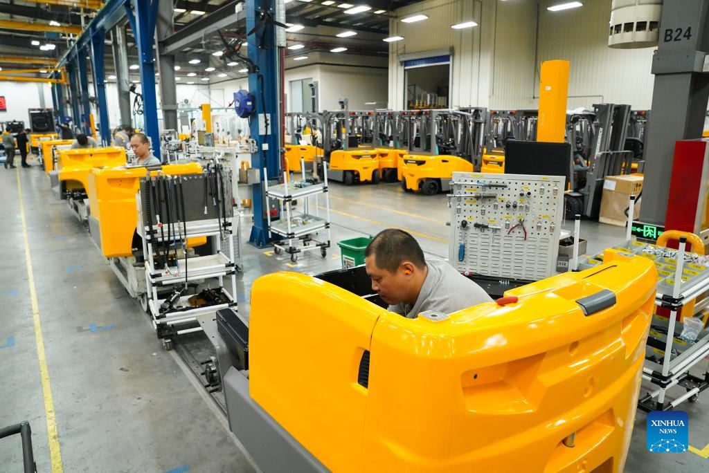 A worker works at a production line of Jungheinrich AG in Qingpu district of east China's Shanghai, Oct. 20, 2021. Jungheinrich AG, a leading intralogistics solutions provider based in Germany, would take part in the China International Import Expo (CIIE) for the fourth time this year. (Xinhua/Ding Ting)