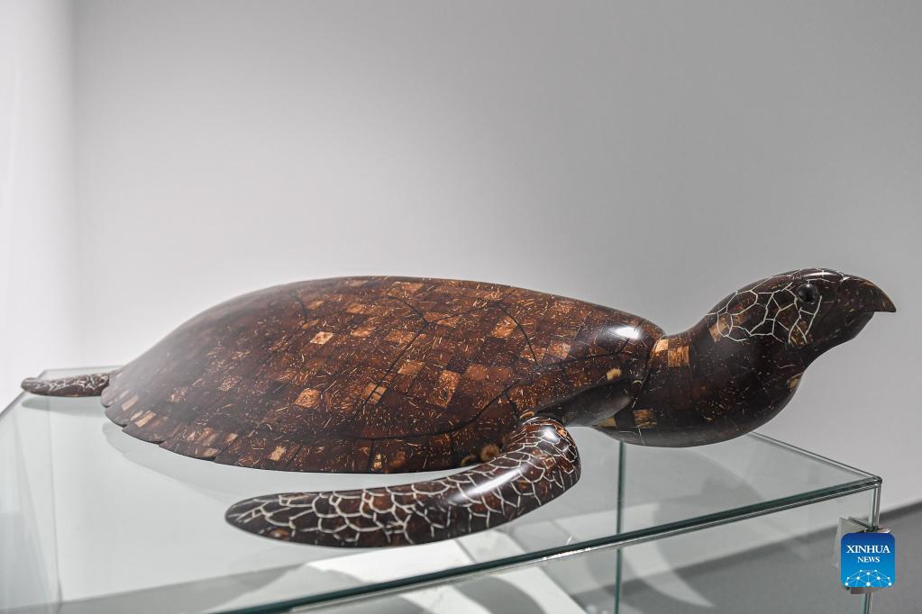 Photo taken on Oct. 9, 2021 shows a coconut carving product made by Ke Qiufeng at an exhibition in Haikou, south China's Hainan Province. Coconut carving, one of China's national intangible Cultural Heritage, has a history of thousands of years in Hainan Province. Made of coconut shell, wood and palm as the material, a good coconut carving work needs to go through complicated procedures and requires refined skills and great patience of a craftsman. Ke Qiufeng, 51, has been engaging in coconut carving since 1994 when he began to learn the skill in a factory. "I just fell in love with it at the first sight," he said. In Ke's eyes, no matter he is making a decorative painting, a delicate vase or just a bowl people would use every day, it's a piece of art. "You must be extremely concentrated when you are carving, or you will get hurt by the knife," Ke said. After years of hard work, Ke has been selected as a representative inheritor of Hainan coconut carvings in the provincial level. In addition to making coconut carvings himself, Ke also gives lectures to students at Hainan Vocational and Technical College every week. Seeing fewer and fewer people would like to devote in this traditional skill, Ke Qiufeng is more worried than anyone. "The skill of coconut carving has been inherited for thousands of years. It would be a pity if it was lost in our generation. That's why I need to keep it alive," he said. (Xinhua/Pu Xiaoxu)