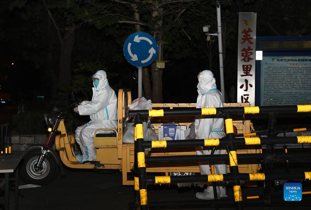 Staff transfer supplies at Furongli residential community in Haidian District in Beijing, capital of China, Oct. 26, 2021. Furongli has been put under closed-off management after one confirmed case of COVID-19 in the community on Oct. 24. Community workers and volunteers worked together to deliver daily necessities for residents during closed-off management. (Xinhua/Ren Chao)