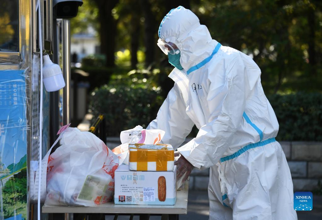 A staff member sorts out delivery packages at Furongli residential community in Haidian District in Beijing, capital of China, Oct. 27, 2021. Furongli has been put under closed-off management after one confirmed case of COVID-19 in the community on Oct. 24. Community workers and volunteers worked together to deliver daily necessities for residents during closed-off management. (Xinhua/Ren Chao)