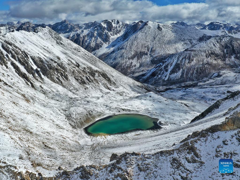 Aerial photo taken on Oct. 23, 2021 shows the scenery of a snow-covered mountain in Batang County, Tibetan Autonomous Prefecture of Garze, southwest China's Sichuan Province. (Xinhua/Liu Kun)