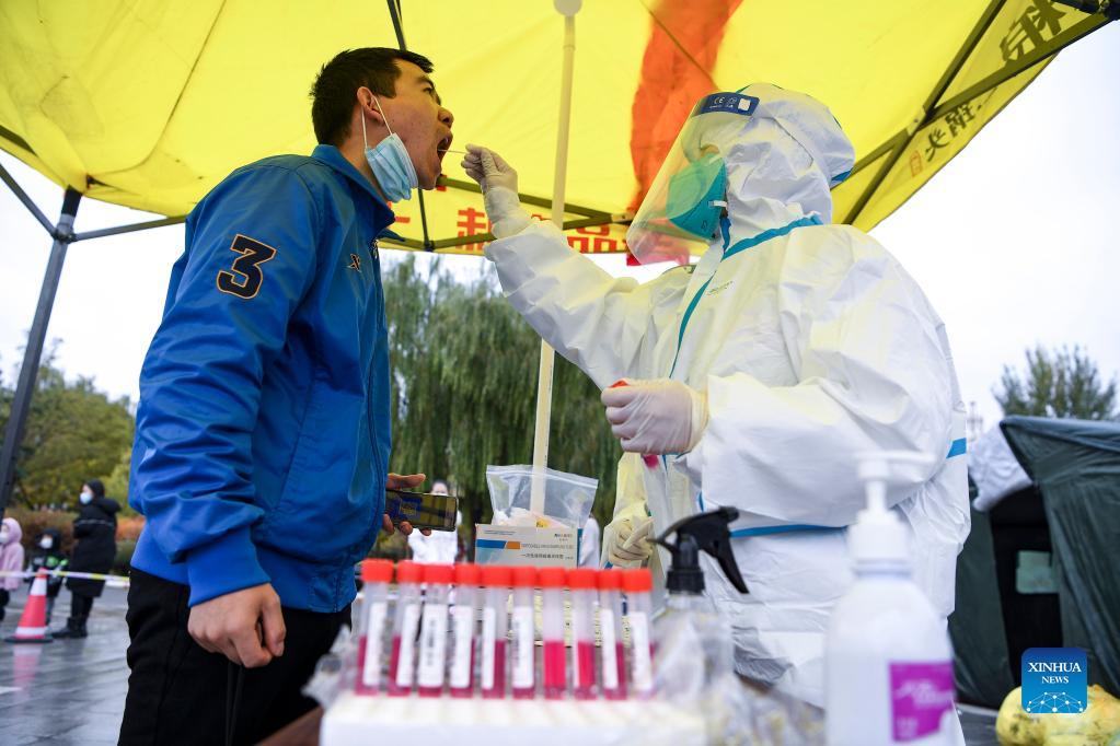 A medical worker takes a swab sample from a resident for nucleic acid testing at a sampling site in Yinchuan, northwest China's Ningxia Hui Autonomous Region, Oct. 27, 2021. Yinchuan launched a second round of all-inclusive nucleic acid testing on Wednesday since new confirmed COVID-19 cases were reported. (Xinhua/Feng Kaihua)
