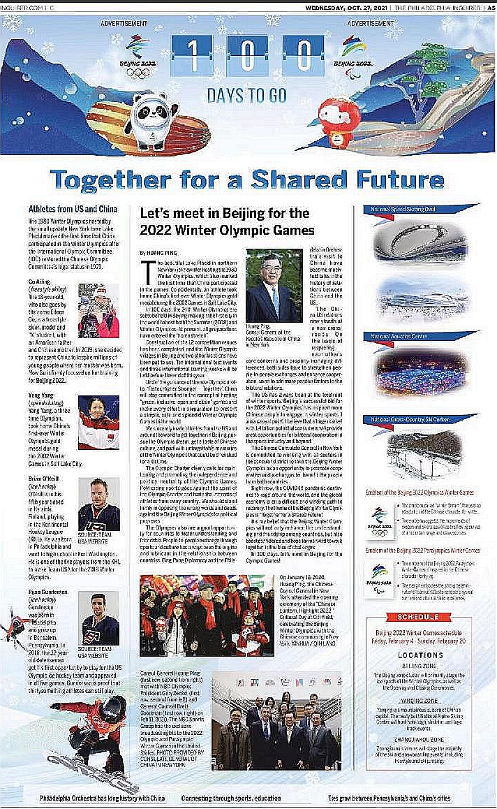 Writing in the Philadelphia Inquirer, Huang invited athletes from the United States and around the world to get together in Beijing, pursue their Olympic dream, experience Chinese culture, and leave with unforgettable memories of the Winter Olympics to be cherished for a lifetime.