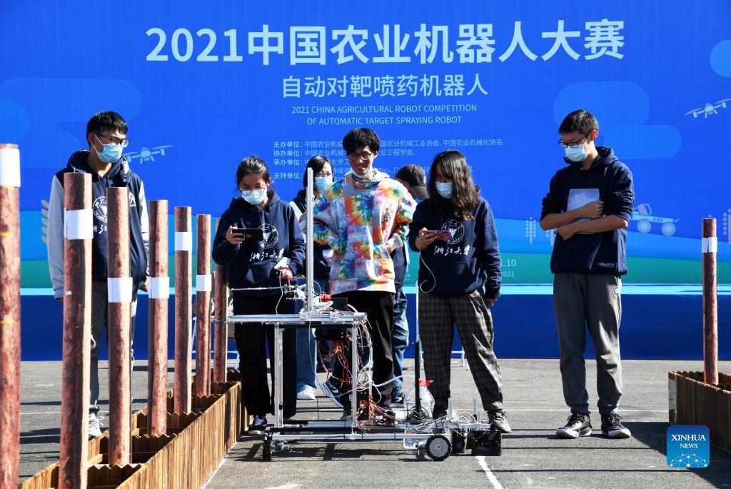 A team participates with their automatic target spraying robot in the 2021 China Agricultural Robot Competition in Qingdao, east China's Shandong Province, Oct. 27, 2021. The 2021 China Agricultural Robot Competition opened here on Wednesday. (Xinhua/Li Ziheng)