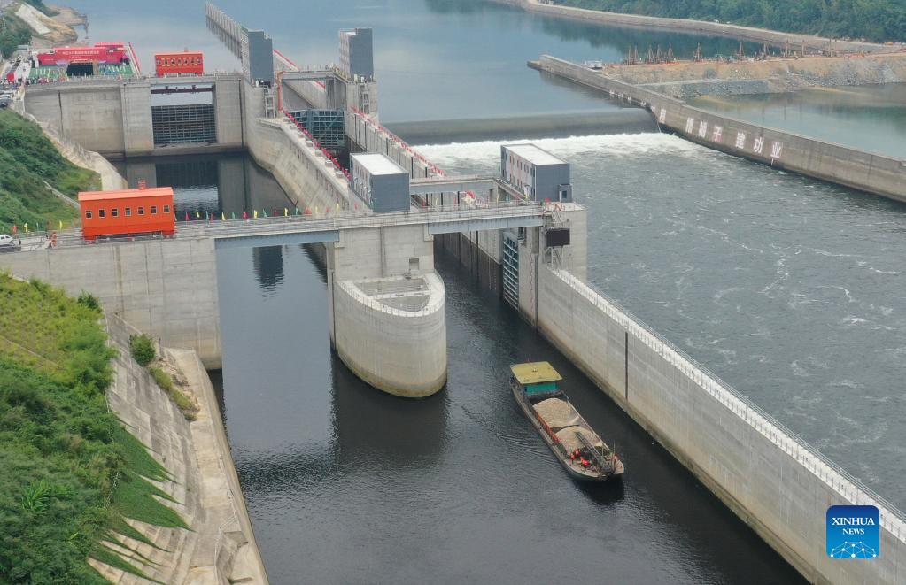 Aerial photo taken on Oct. 28, 2021 shows boats passing through a water gate on Minjiang River in southeast China's Fujian Province. (Xinhua/Lin Shanchuan)