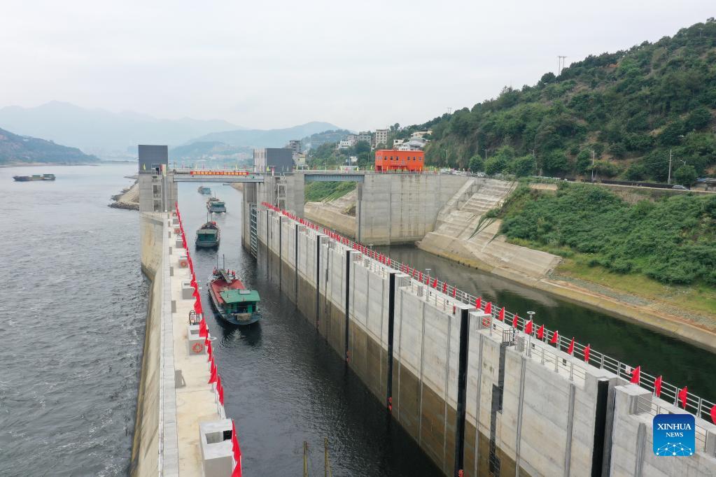 Aerial photo taken on Oct. 28, 2021 shows boats passing through a water gate on Minjiang River in southeast China's Fujian Province. (Xinhua/Lin Shanchuan)