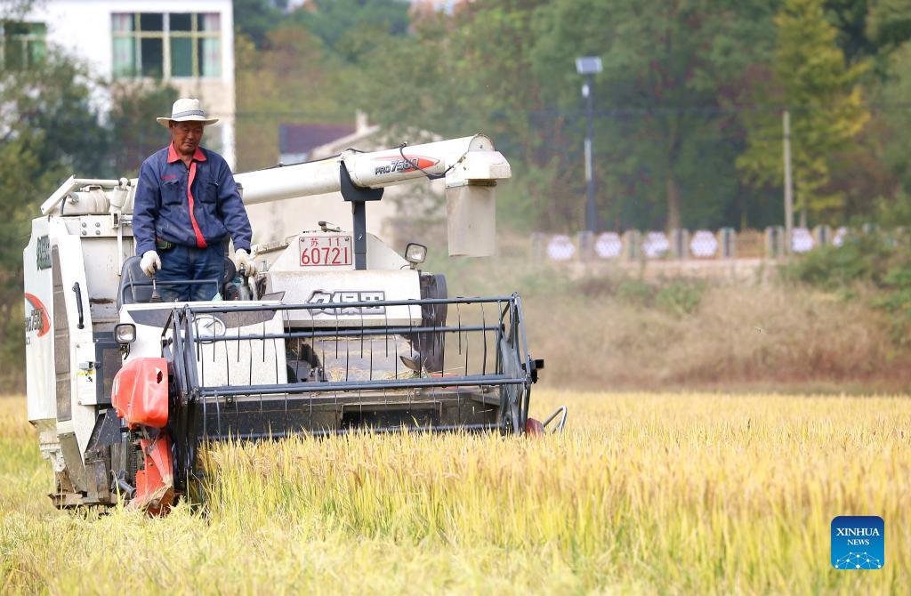 Photo taken on Oct. 28, 2021 shows a farmer operating a harvester on a rice field in Jurong City, Jiangsu Province. (Photo by Zhong Xueman/Xinhua)