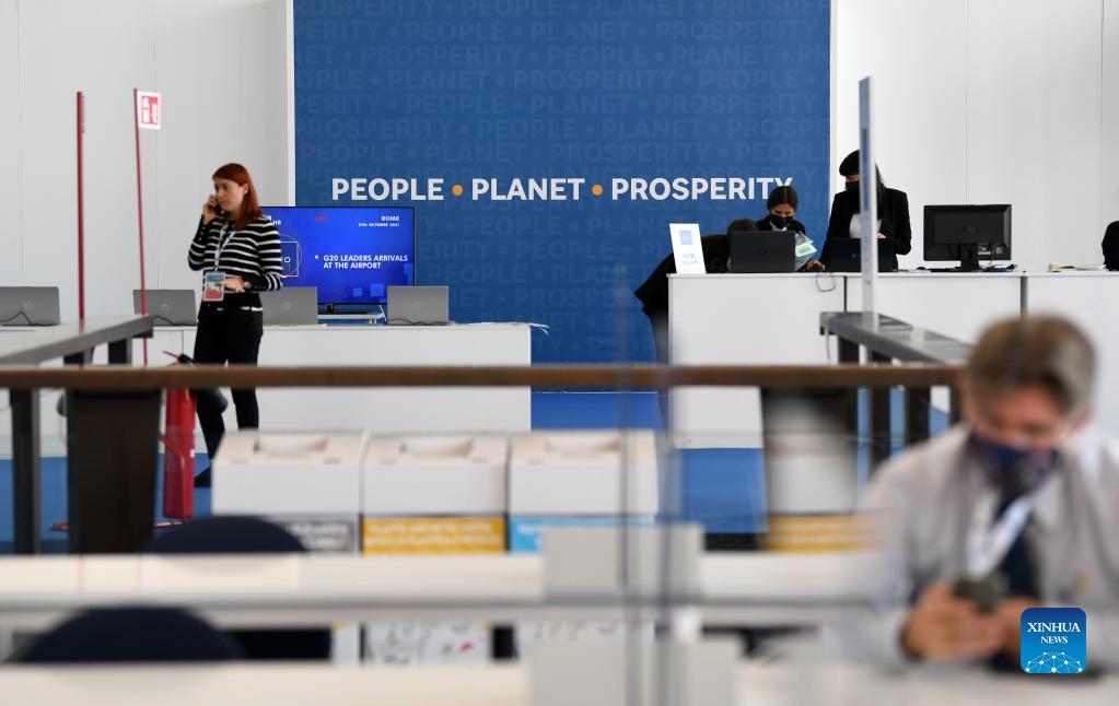 People work at the media center of the G20 Heads of State and Government Summit in Rome, Italy, on Oct. 28, 2021. The summit of the Group of 20 (G20) leading economies is about to kick off in Italy's capital amid tight security measures and with a packed agenda. (Xinhua/Jin Mamengni)