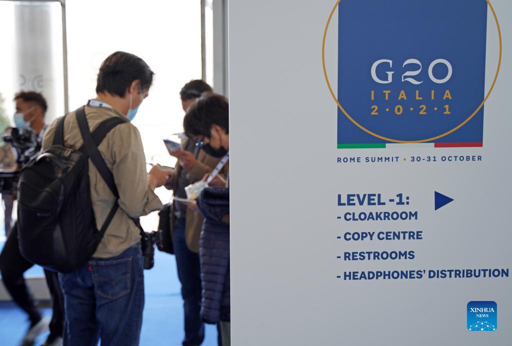 Journalists are seen at at the media center of the G20 Heads of State and Government Summit in Rome, Italy, on Oct. 28, 2021. The summit of the Group of 20 (G20) leading economies is about to kick off in Italy's capital amid tight security measures and with a packed agenda. (Xinhua/Jin Mamengni)