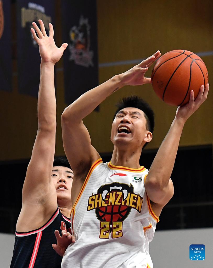 Yu Changchun (R) of Shenzhen Aviators competes during the 6th round match between Guangdong Southeast Tigers and Shenzhen Aviators at the 2021-2022 season of the Chinese Basketball Association (CBA) league in Zhuji, east China's Zhejiang Province, Oct. 28, 2021. (Xinhua/Li An)
