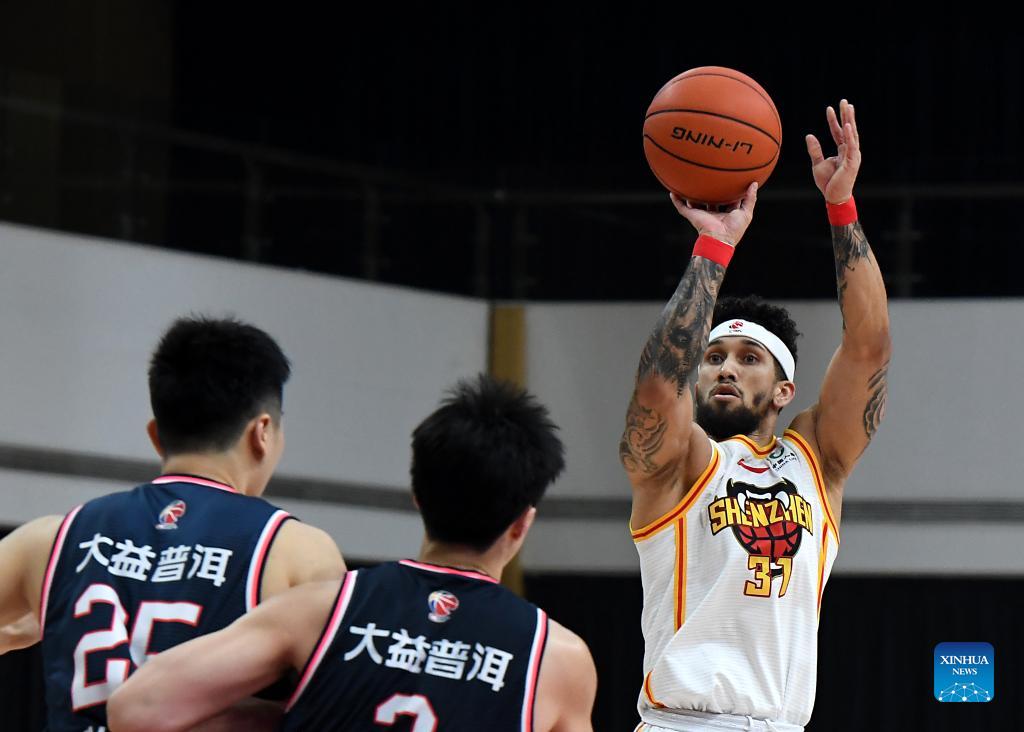Askia Booker (R) of Shenzhen Aviators shoots during the 6th round match between Guangdong Southeast Tigers and Shenzhen Aviators at the 2021-2022 season of the Chinese Basketball Association (CBA) league in Zhuji, east China's Zhejiang Province, Oct. 28, 2021. (Xinhua/Li An)