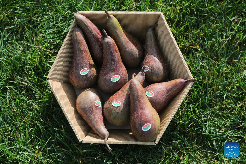 Red conference pears are seen in Sint-Gillis-Waas, Belgium, Oct. 22, 2021. At the upcoming 4th China International Import Expo (CIIE) to be held this November in Shanghai, Dole and BFV (Belgian Fruit Valley) will introduce a Belgian red conference pear to the Chinese and Asian market for the first time. This conference pear with dark red skin is a variety of the green conference pear which had sold well on the Chinese market for the past decade. (Xinhua/Zheng Huansong)