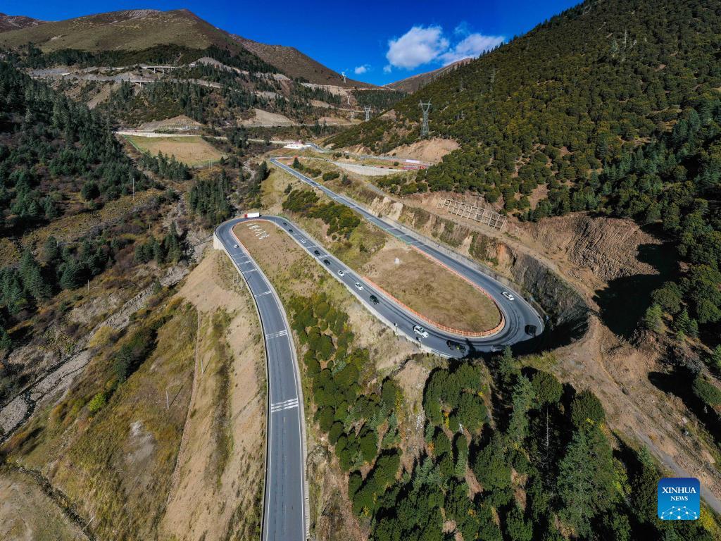 Aerial photo taken on Oct. 19, 2021 shows the winding road in Yajiang County, Tibetan Autonomous Prefecture of Garze, southwest China's Sichuan Province. (Xinhua/Wang Xi)