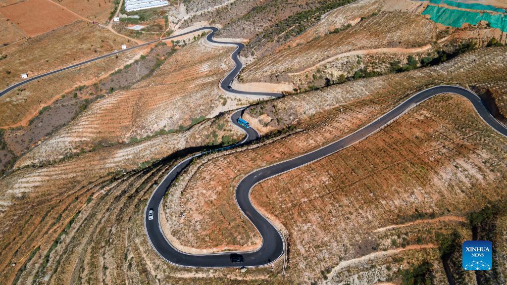 Aerial photo taken on Oct. 20, 2021 shows the winding road in Xiangcheng County, Tibetan Autonomous Prefecture of Garze, southwest China's Sichuan Province. (Xinhua/Xu Bingjie)