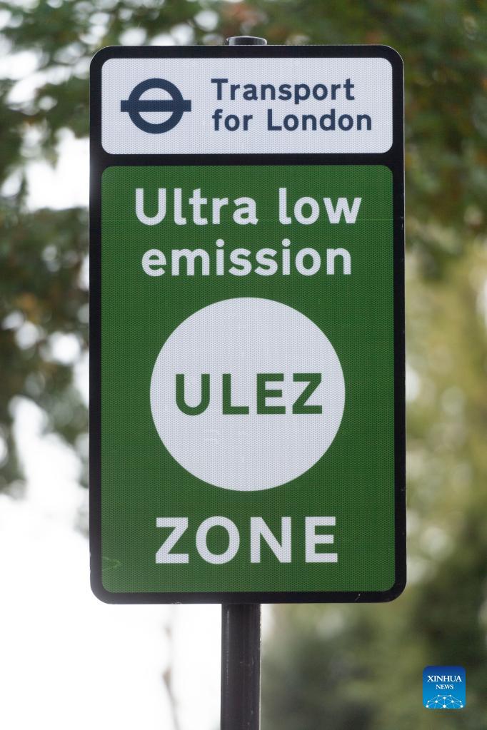 A ULEZ (ultra low emission zone) sign is seen in London, Britain, Oct. 26, 2021. The 26th United Nations Climate Change Conference of the Parties (COP26) will be held from Oct. 31 to Nov. 12 in Glasgow. (Photo by Ray Tang/Xinhua)