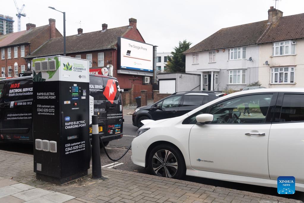 An electric car is seen at a charging point in London, Britain, Oct. 26, 2021. The 26th United Nations Climate Change Conference of the Parties (COP26) will be held from Oct. 31 to Nov. 12 in Glasgow. (Photo by Ray Tang/Xinhua)