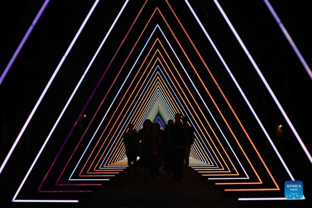 People are seen in the light installation The Wave in Brussels, Belgium, on Oct. 28, 2021. The ten-day event Bright Brussels, the festival of lights in Brussels, started on Thursday. (Xinhua/Zheng Huansong)