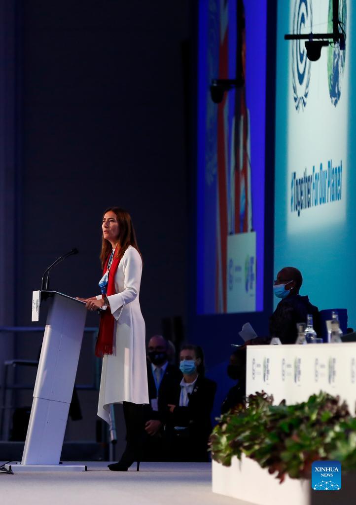 Carolina Schmidt, chairwoman of the COP25 and the environment minister of Chile, speaks at the opening ceremony for COP26 in Glasgow, Scotland, the United Kingdom, on Oct. 31, 2021. The 26th United Nations Conference of Parties on Climate Change (COP26), delayed by a year due to the COVID-19 pandemic, kicked off on Sunday in Glasgow, Scotland. As the first conference after the five-year review cycle under the Paris Agreement inked in 2015, delegates are expected to review overall progress and plan future actions on climate change in the coming two weeks. (Xinhua/Han Yan)