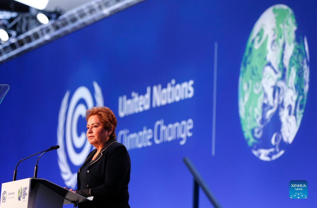 Executive Secretary to the United Nations Framework Convention on Climate Change Patricia Espinosa speaks at the opening ceremony for COP26 in Glasgow, Scotland, the United Kingdom, on Oct. 31, 2021. The 26th United Nations Conference of Parties on Climate Change (COP26), delayed by a year due to the COVID-19 pandemic, kicked off on Sunday in Glasgow, Scotland. As the first conference after the five-year review cycle under the Paris Agreement inked in 2015, delegates are expected to review overall progress and plan future actions on climate change in the coming two weeks. (Xinhua/Han Yan)